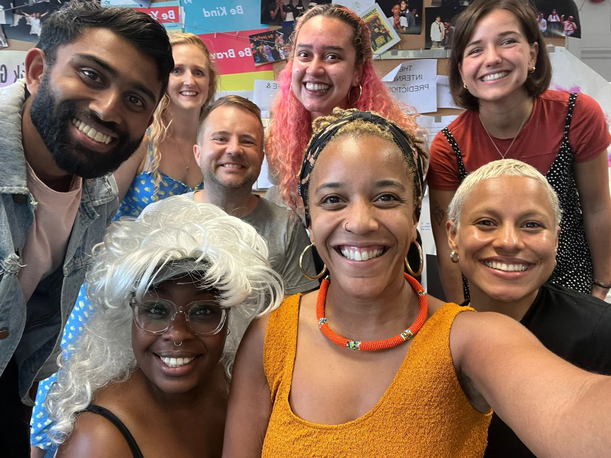The Company Three team (left to right): Gavin Joseph (Associate Artist), Katie Burse (Executive Director - maternity cover), Kami Gakuru (Admin and Office Co-ordinator), Ned Glasier (Artistic Director), Angie Peña Arenas (Project Manager), Nuna Sandy (Associate Artistic Director), Amber Ruby (Associate Artist), Gabi Spiro (Producer, Exchange and Relationships).